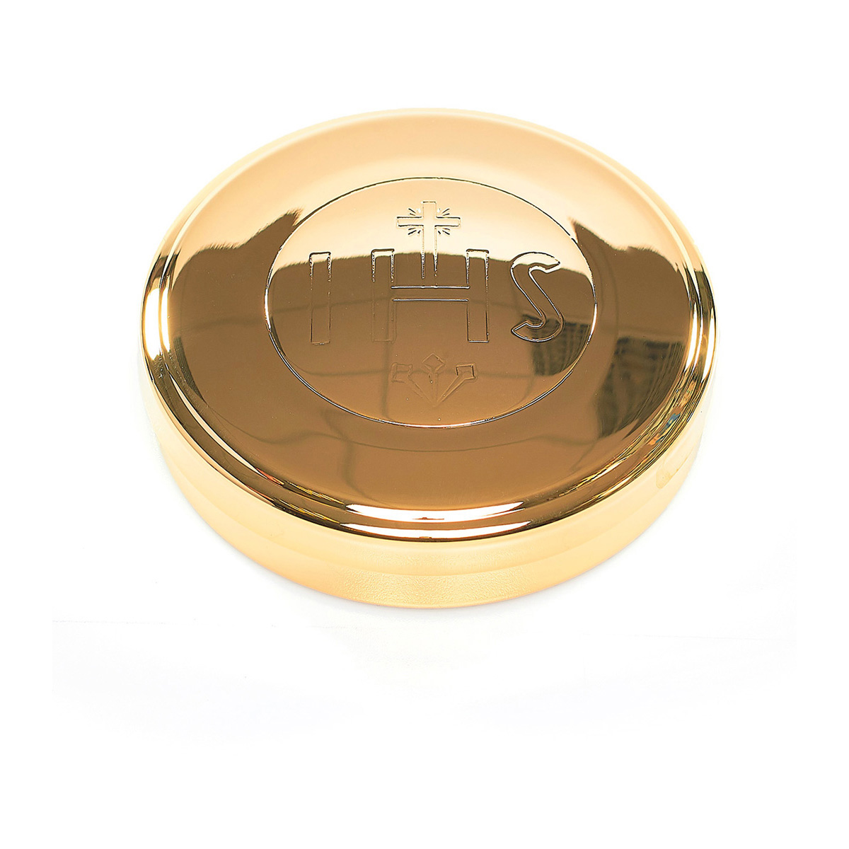 Burza s vyrytým nápisom IHS. Vyrobené z kovu, pozlátené.