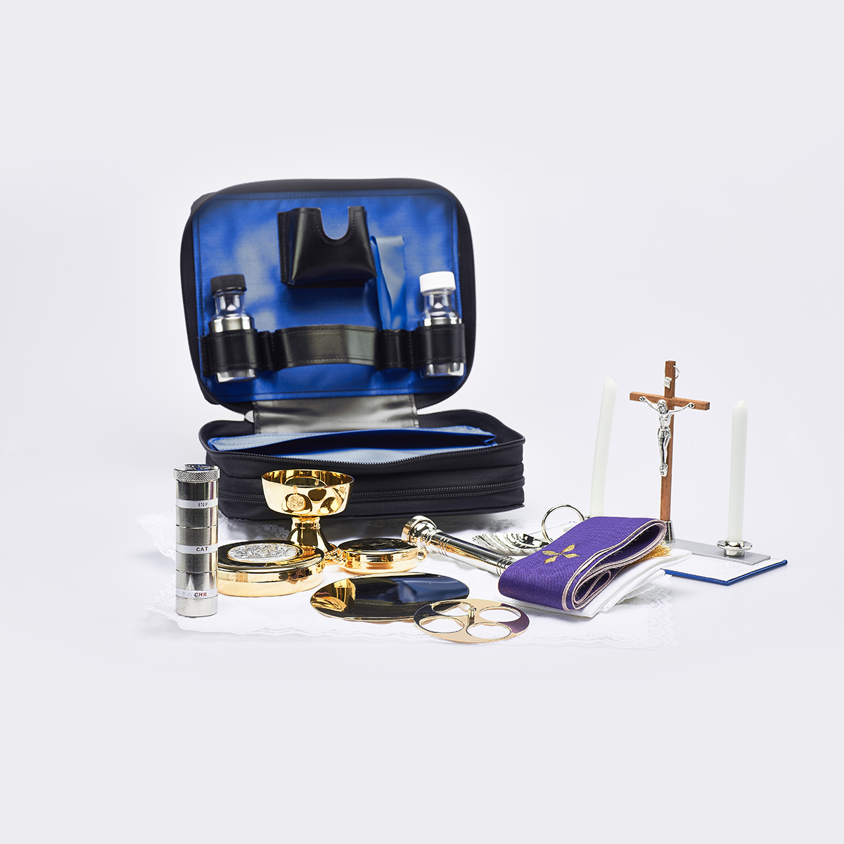 obsah súpravy: kalich, burza, kropáč, 3 ks olejky, paténa, nádobka na udeľovanie sviatosti krstu, 2 ks nádobky na vodu a víno, 2 ks sviece, kríž, štóla, kalichové prádlo
