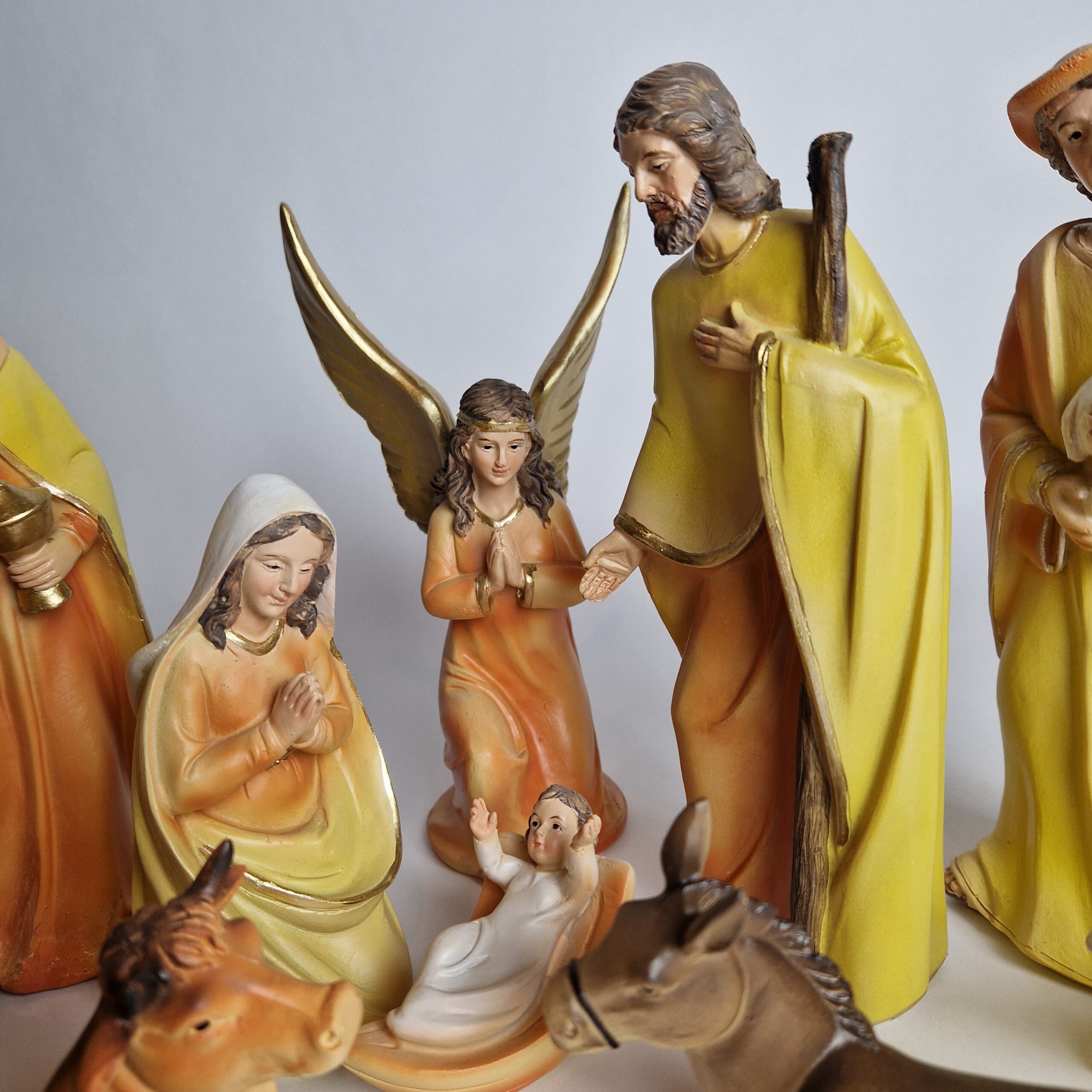 Figúrky z betlehemu. Jednoduchý, moderný rad figúrok v oranžovej a žltej farbe so zlatými dekoráciami.