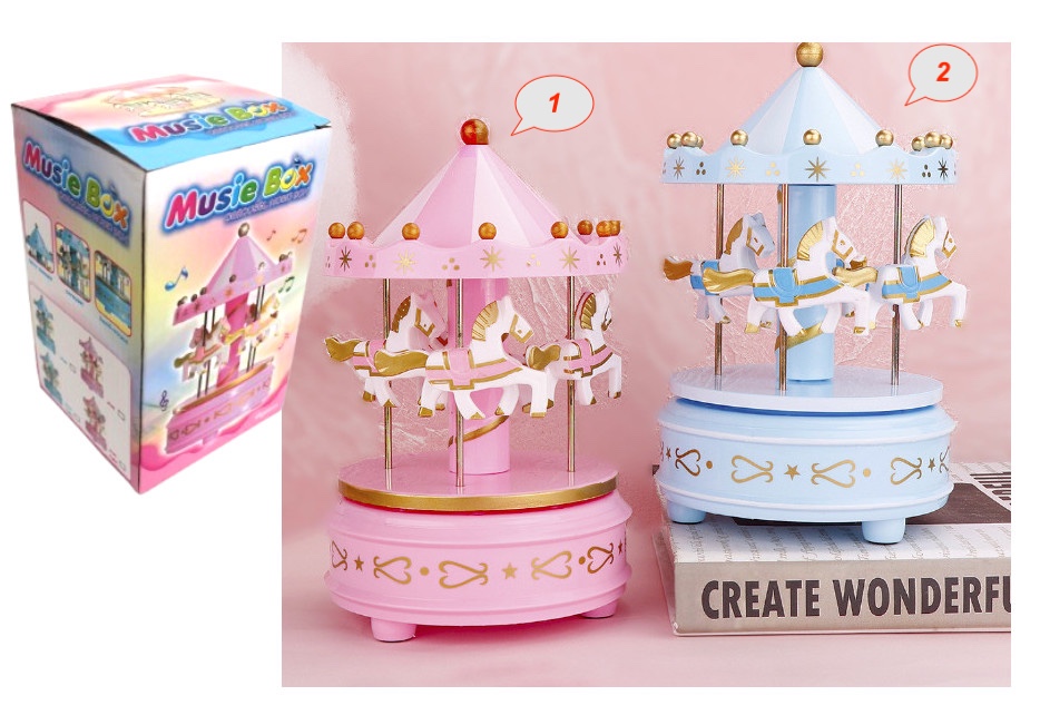 Kolotoč s hracou skrinkou "Kone" - hračka v retro štýle . Mechanická hračka je vyrobená z plastu a dreva. Hračka sa uvedie do pohybu otočením v opačnom smere. Kolotoč je bielo-modrý so zlatými akcentmi.