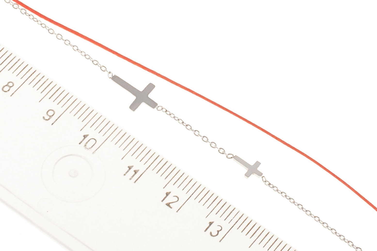 Elegantný strieborný náramok s ozdobnými príveskami v tvare krížika, spolu s černenou šnúrkou.