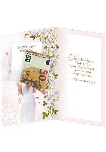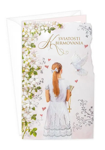 Blahoželanie ku sviatosti birmovania s textom vo vnútri priania. Pridanou hodnotou priania ku sviatosti birmovania je klopa na peniaze vo vnútri. Súčasťou blahoželania je obálka.