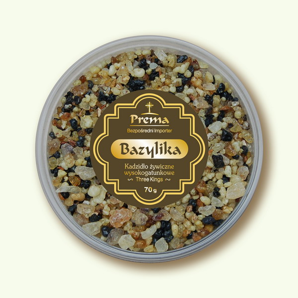 BAZYLIKA je kostolný kadidlo so zaujímavou, mierne živicovou a jemnou lesnou vôňou. Mierne vstúpi do kvetinovej tóny. Stredne veľké granule s väčšími nugety živice.