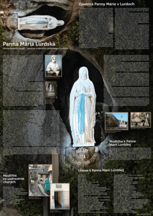 Veľkorozmerný plagát (rozmer A1) – Lurdská Panna Mária s historickými kontextom udalostí, ktoré súviseli so vznikom i formovaním zjavení v Lurdoch chce byť pomôckou každému, kto sa snaží porozumieť posolstvu a významu udalostí v Lurdoch. Plagát je určený tak do domácnosti na zavesenie ale i ako pomôcka pre katechézu do farností, či na hodiny náboženstva.