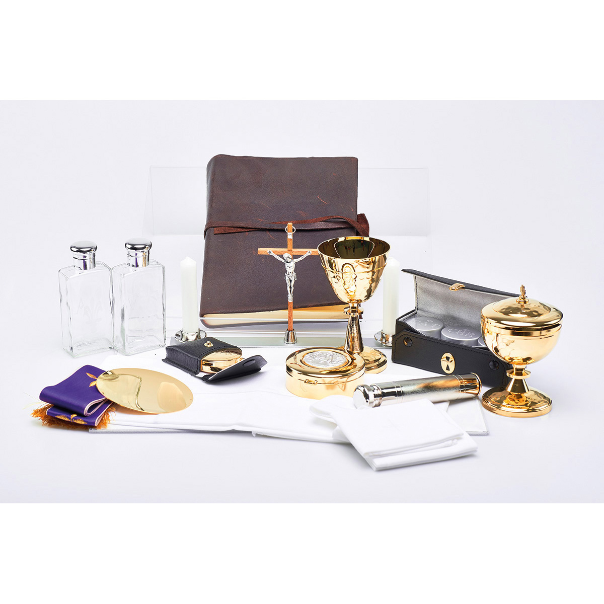 kalich, cibórium, paténa, kropáč, burza, 2 ks nádobky na vodu a víno, kríž a sviečky, 3 ks olejky a štóla.