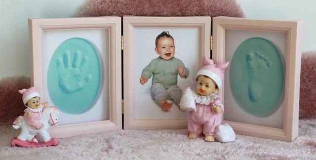 fotorámček je k dispozícii v 2 farbách: modrý, ružový fotorámček pre prvý obrázok dieťatka + miesto pre otlačok na chodidlo a ručku dieťatka vrátane hmoty, valčeka