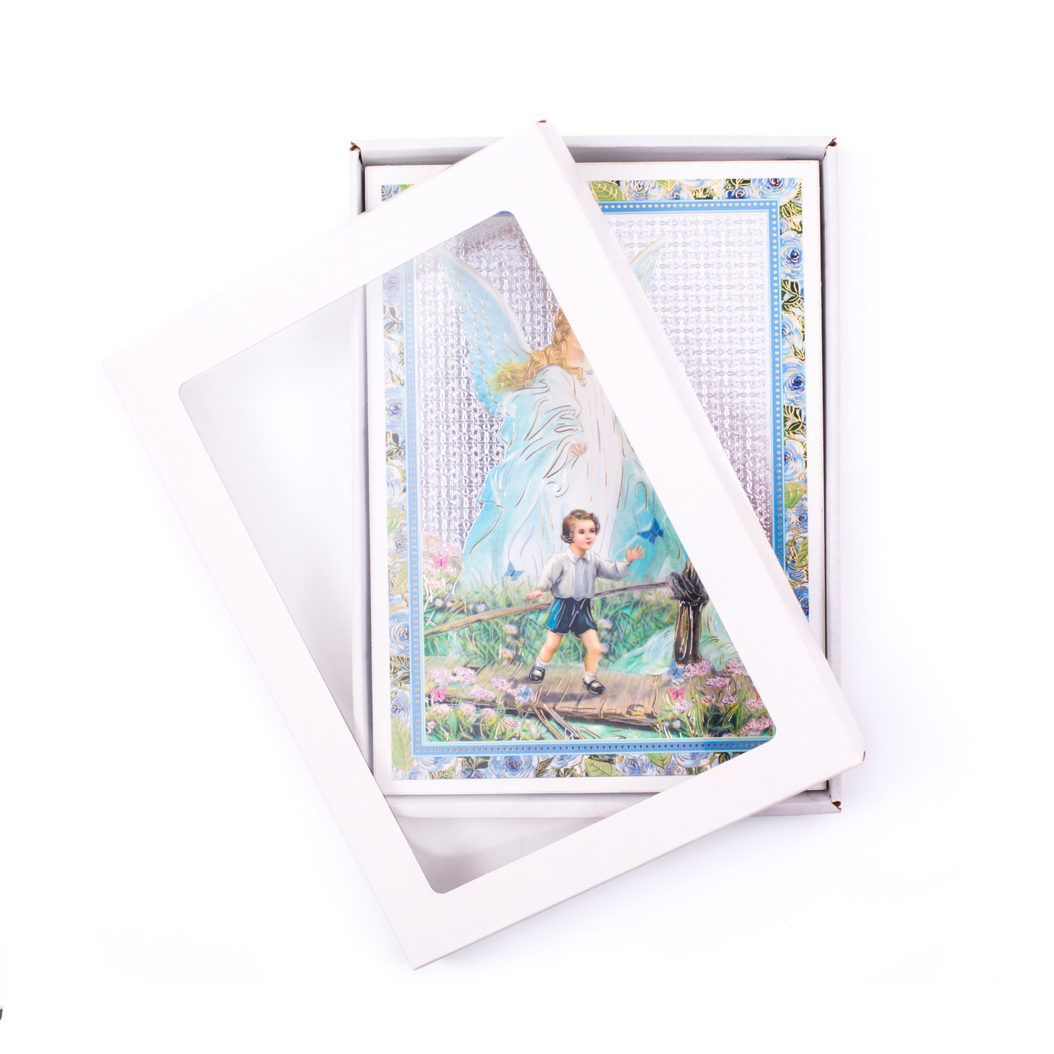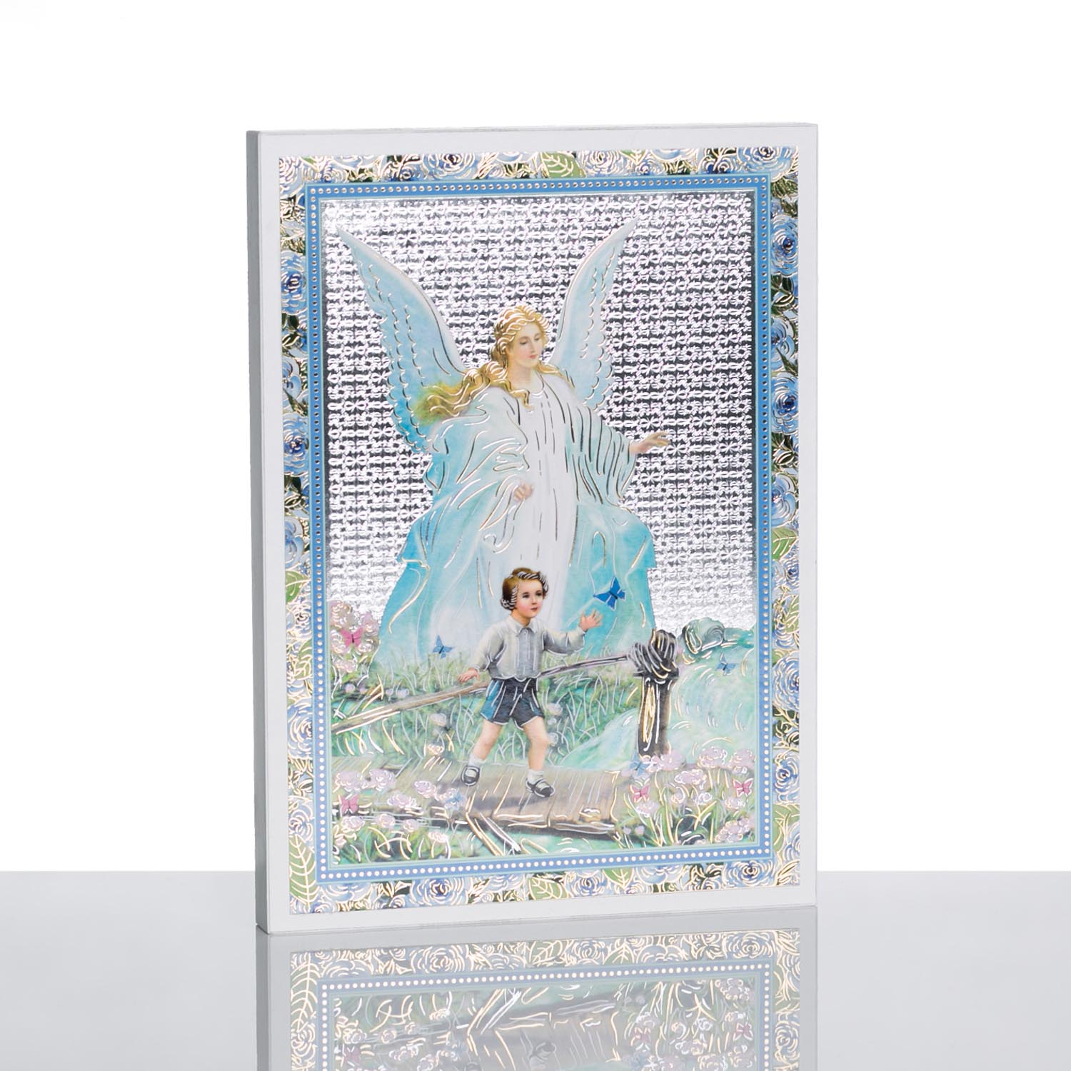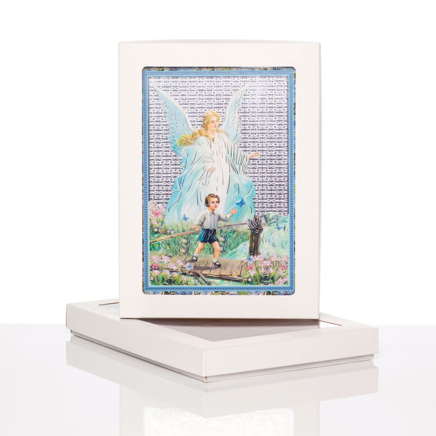 Unikátna ikona s krásnou, farebnou grafikou. Produkt zobrazuje anjela strážneho a malého chlapčeka. Prítomnosť nebeskej bytosti v blízkosti hrajúceho sa dieťaťa zdôrazňuje povinnosť pridelenú anjelom - starať sa o človeka v každom okamihu jeho života. Produkt má početné dekorácie a strieborné pozadie. Ukončené v modrej farbe.