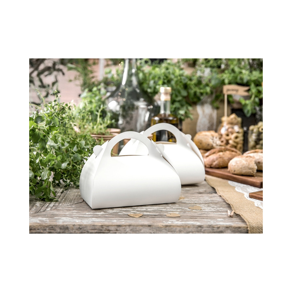 Dekoratívne krabičky na tortu vyrobené z bieleho papiera.