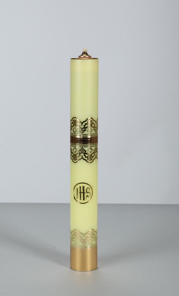 Žltá liturgická sviečka s olejovou vložkou z veľmi odolného materiálu dokonale imitujúceho pravý parafín.