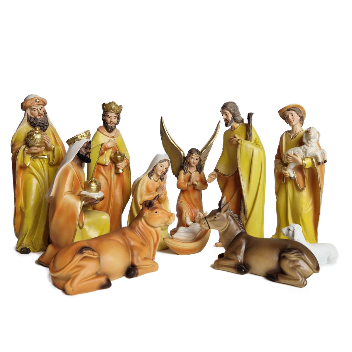 Figúrky z betlehemu. Jednoduchý, moderný rad figúrok v oranžovej a žltej farbe so zlatými dekoráciami.