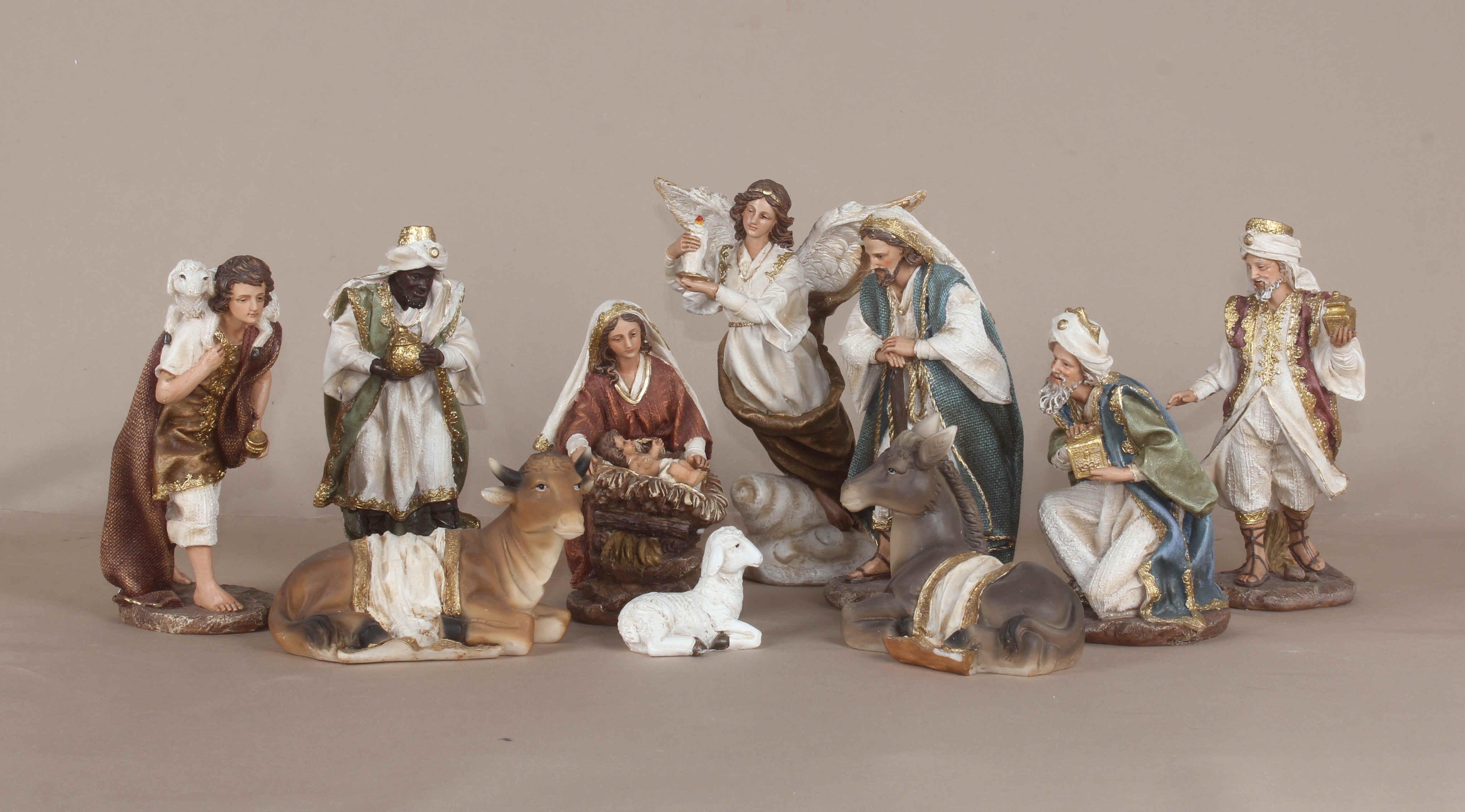 Figúrky do vianočného betlehemu. V róbach s textúrou imitujúcou plátno, v elegantných pastelovo-zlatých farbách.