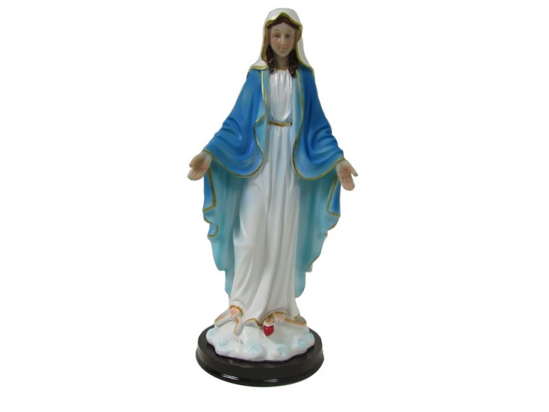 Figúrka je vyrobená z polyresinu (polyresin je zmes živíc, alabastrových múčok a keramika). Máriine šaty v odtieňoch biela / svetlo modrá. Kabát v jemnej modrej so zlatými doplnkami. Celá figúrka je osadená na podstavci v tvare oblaky s hadom.