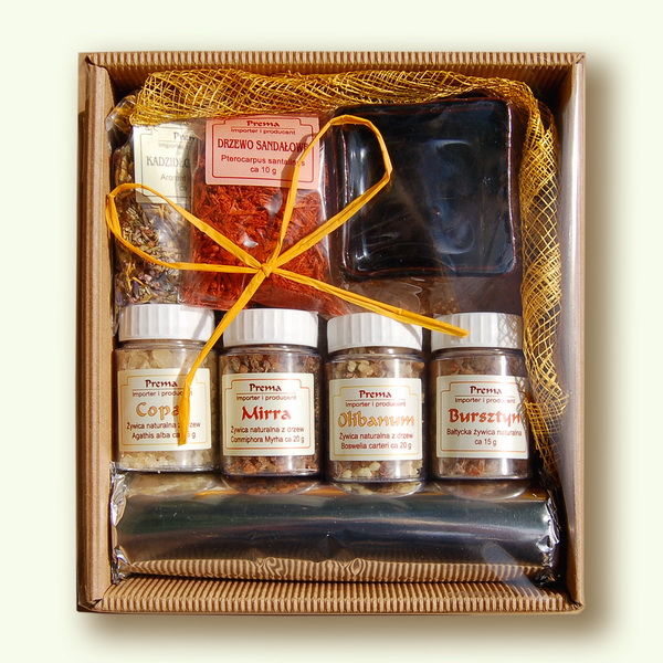 Sada obsahuje šesť druhov prírodného kadidla: myrhu, olibanum, kopál, baltský jantár, bylinkové kadidlo a santalové drevo
