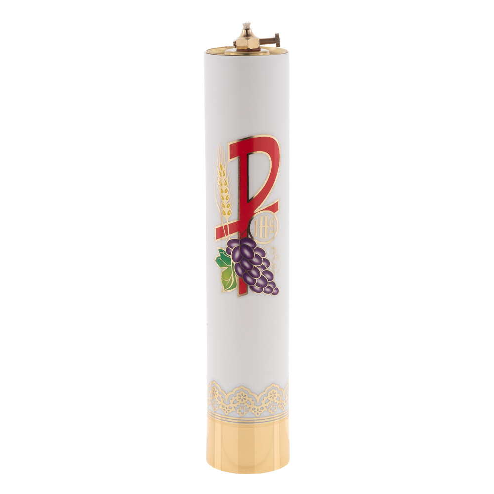 Liturgická sviečka v bielej farbe s eucharistickým znakom s olejovou vložkou 180ml vyrobená z veľmi odolného materiálu dokonale imitujúceho pravý parafín.