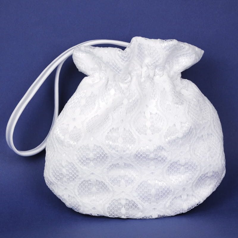 Pohodlné vrecko na prijímanie na krátkom popruhu, ideálne na držanie v ruke. Vyrobené z matného saténu pokrytého vrstvou jemnej čipky, spája klasickú jednoduchosť s jedinečným štýlom. Taška je elastická pre jednoduché použitie a jej veľkosť umožňuje pojať všetky potrebné predmety, ako je malá kniha alebo ruženec.